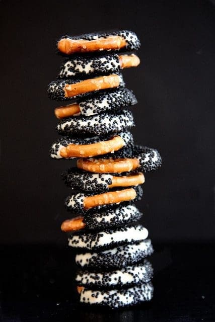 Sprinkles are totally necessary. I chose a black nonpariel sprinkle. Black and white is the theme we’re going for. Instead of sprinkles you might consider dipping your pretzels into a crumbled chocolate cookie. Yea… cookie dipped pretzels. Go there.