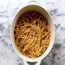 The onions. ย Oh the onions. ย They actually cook longer than the pasta itself. ย The onions need a bit of caressing with butter and olive oil and low heat.