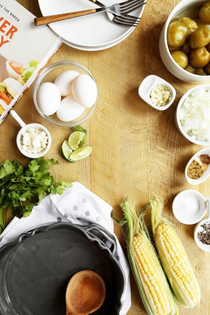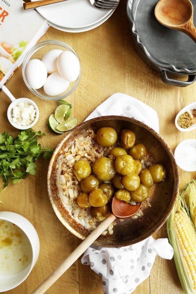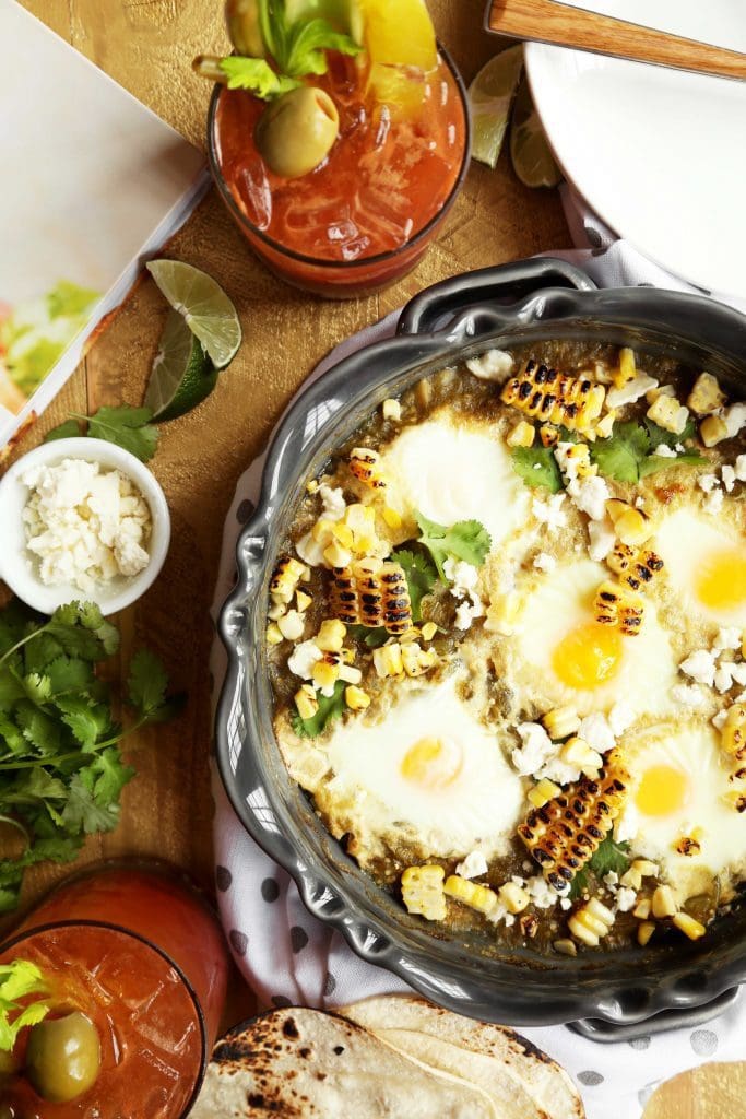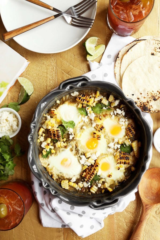 My shakshuka dish is hardly the traditional bright red, and is clearly sprinkled with more roasted corn than salty feta cheese. I thought we’d simmer eggs in a brightly flavored green sauce made of tomatillos, topped with sweet toasted corn and salty cotija cheese. It’s a curtsey to all that is good about spicy shakshuka, a curtsey with a shimey shake, served with toasted corn tortillas instead of pita… just as good for dinner as it is for brunch.