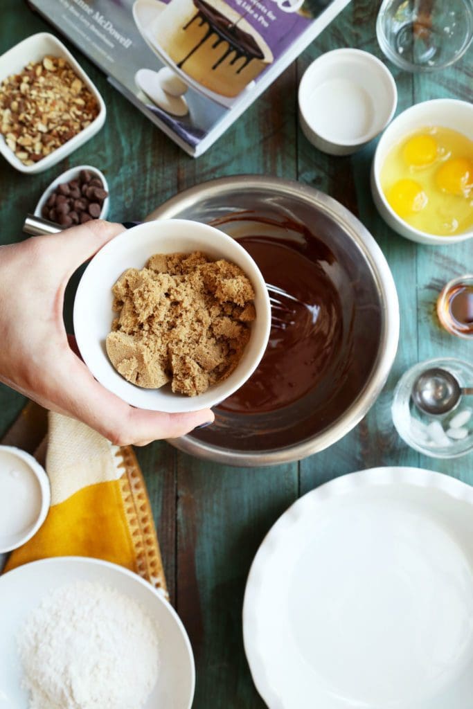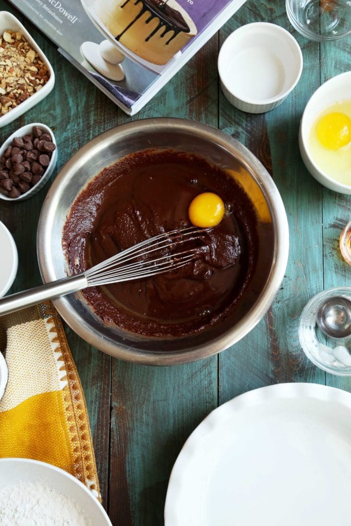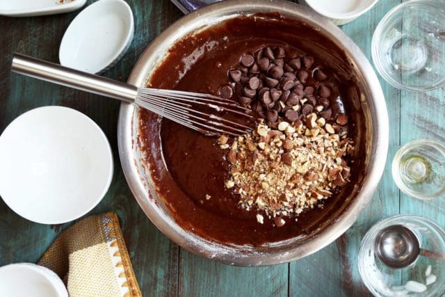 - Add both sugars to the chocolate mixture and mix well with a spatula. Add the eggs one at a time, mixing until each one is fully incorporated. Whisk in the vanilla. Add the flour and salt and mix well to ensure there are no flour pockets, but do not overmix. Fold in the semisweet chocolate and almonds.