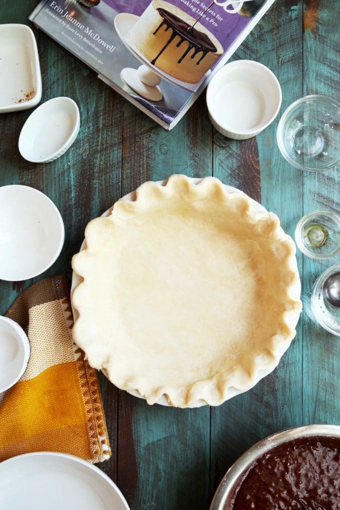Remember the pie crust? It’s back in the game! Rolled out, crimped and ready for a quick bake in the oven before the brownie batter goes in.