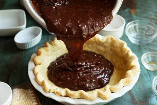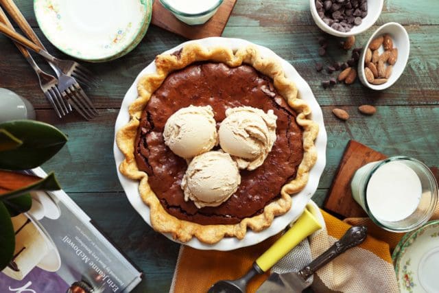 - Pour the batter into the piecrust and bake until a toothpick inserted into the center of the brownie comes out with moist, clumpy crumbs, 45 to 50 minutes. Do not overbake! Let the pie cool for at least 20 minutes before slicing and serving. I love this pie served with coffee ice cream.