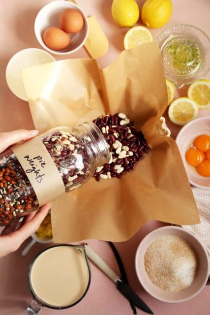 - Fill the pie to the BRIM with pie weights (mine are the economical kind – dried beans). Go as high as the crimped edges with the beans. The weight will keep the edges from sinking into the pan.