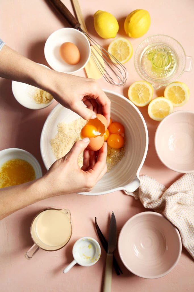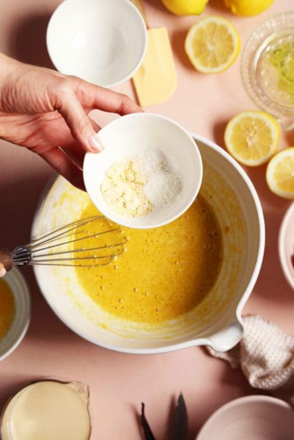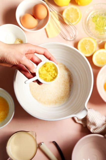 Rub the lemon zest into the sugar in a large bowl. This will release the citrus oil and make the pie extra lemony. Baker’s tricks – we got em.