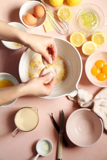 - To make the filling, place sugar, lemon zest, and vanilla bean (if using) in a medium bowl. With your fingers, work the lemon zest and vanilla into the sugar until the sugar is fragrant.