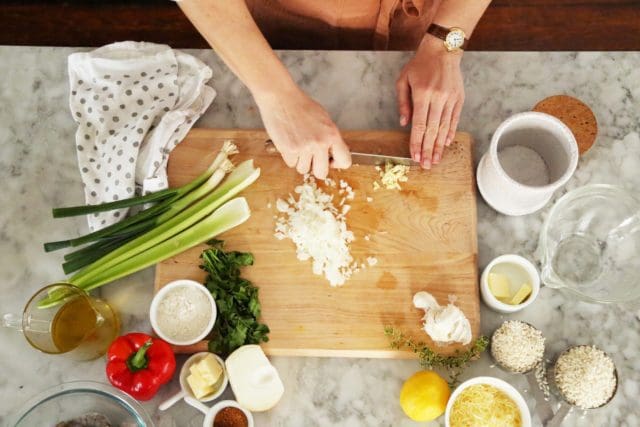 I like to keep a bit of fresh thyme, butter, and parmesan for finishing the risotto but – we’ll start with onion and garlic.