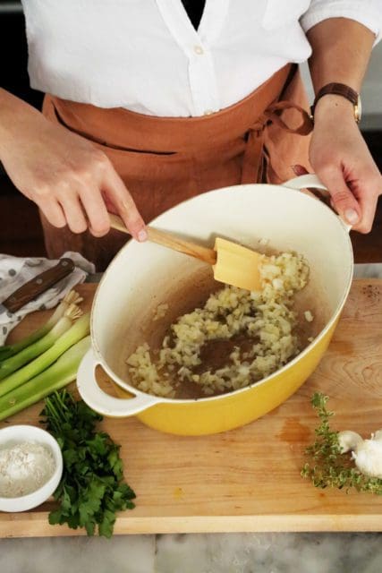 Roux is equal parts fat (we’re using butter) and flour, simmered together until deep caramel brown. The flour toasts and the mixture will add thickening and toasty flavor to the รฉtouffรฉe.