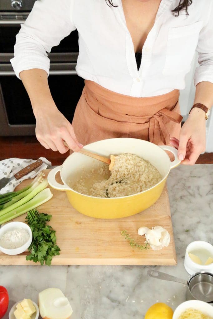 With the pot over low heat, add the warm broth a few ladles at a time. Stir the risotto slowly as the broth steams and absorbs. It’s meditative. It’s satisfying. It’s a fun way to cook.