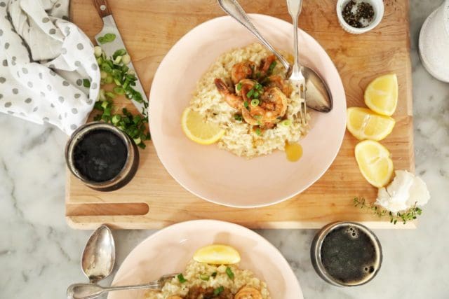 Make this kitchen adventure your own. If you want to make it easier and get to a cozy dinner on the couch faster, skip the risotto and buy a bag of frozen asparagus or mushroom risotto from Trader Joe’s. Easy – the shrimp will come together in 30 minutes. Do what you will, just enjoy.