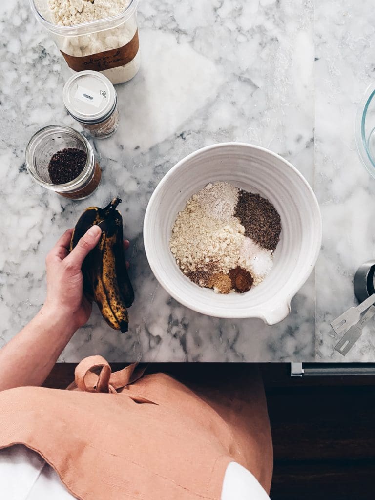This banana bread is a happy…. I won’t say ‘accident’… but a happy happening. I loosely followed classic banana bread proportions but subbed more healthful ingredients.