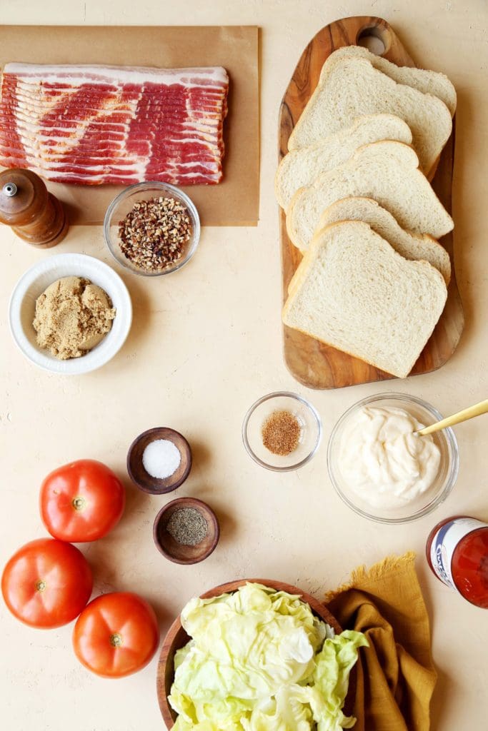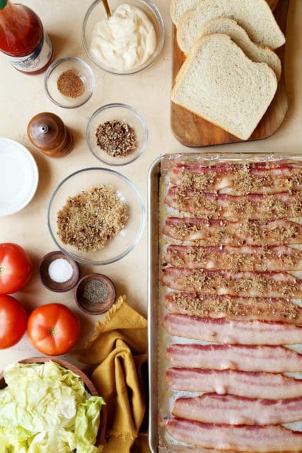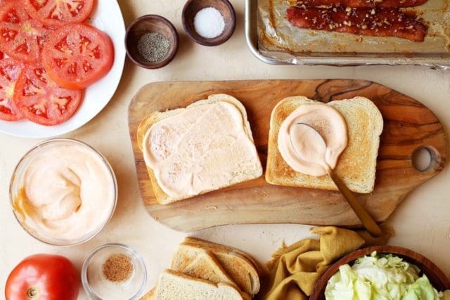 - To assemble the sandwiches, toast the bread lightly (or donโt – itโs your sandwich). Spread both slices generously with spicy mayonnaise. Layer with 3 or 4 slices of bacon, seasoned tomatoes, lettuce, and the top of the bread. Give it a little smash, slice it in half if youโd like and enjoy!