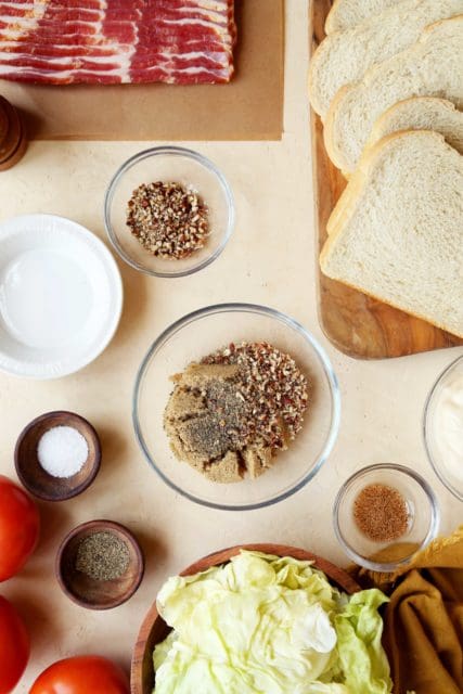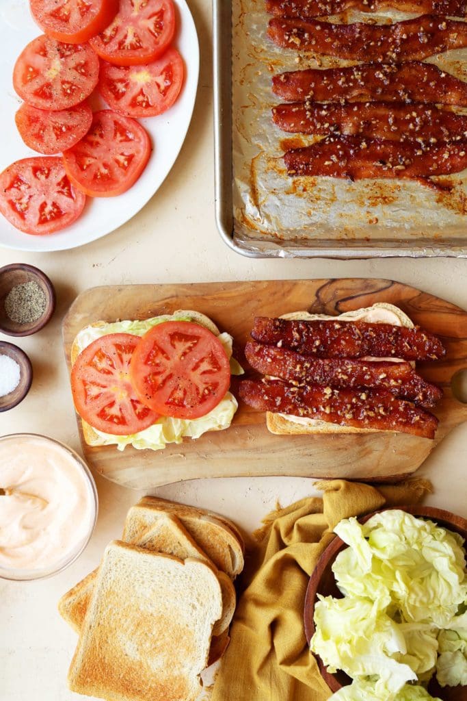 Layer bacon, butter lettuce, and seasoned tomatoes. Pile it as high as your hunger.