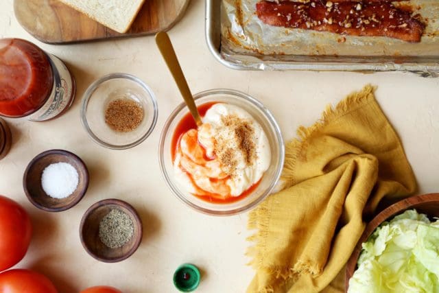 Add hot sauce (I love Crystal here) and a sprinkle of garlic powder to the mayonnaise to add a spicy bite to compliment the candied bacon.
