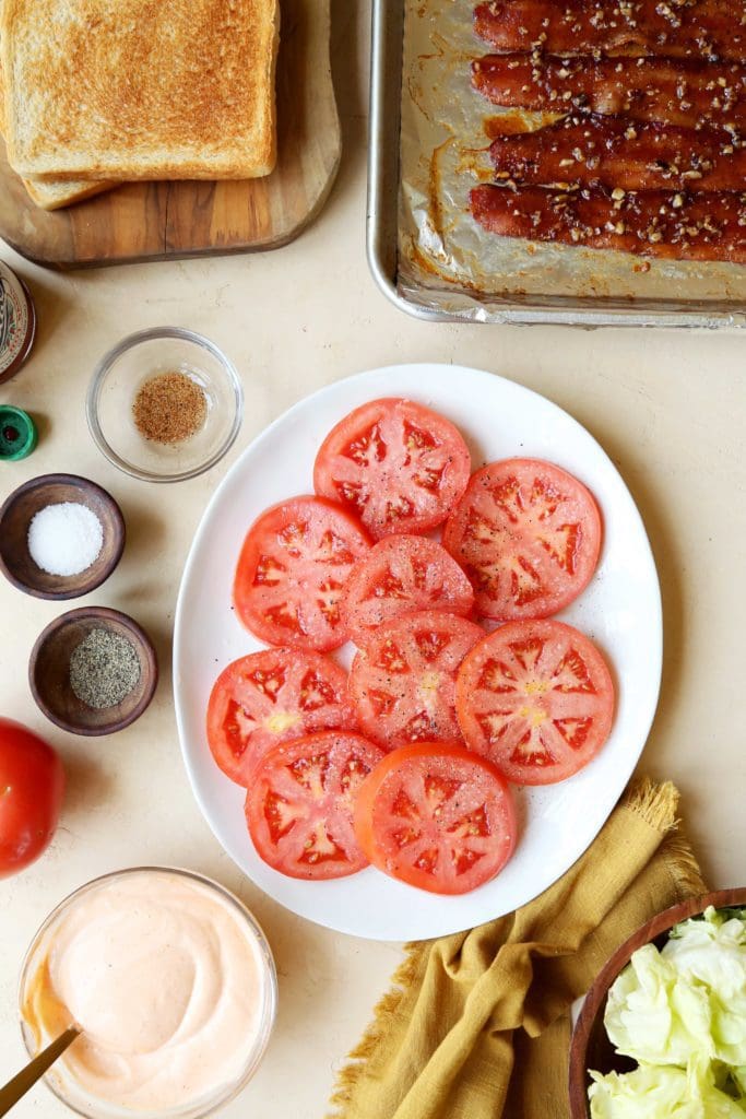 - To assemble the sandwich, slice tomatoes and allow to rest on a double layer of paper towel or a clean lint-free kitchen towel. Flip once. Season tomato slices with salt and pepper.