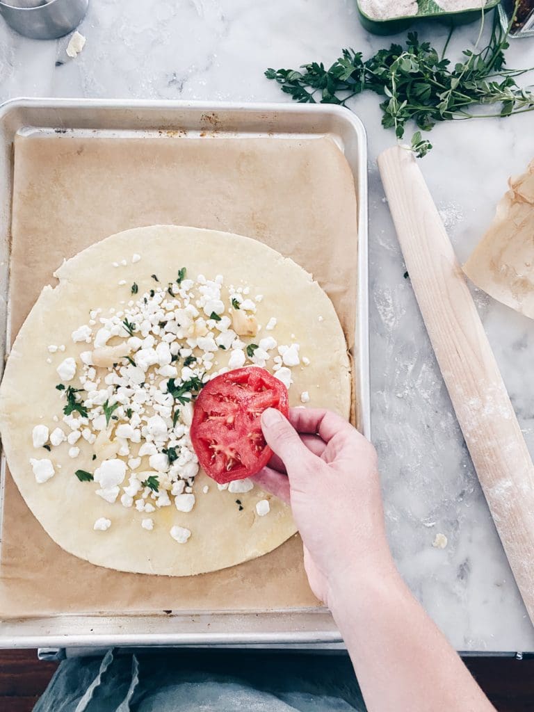 - To assemble, brush the pie crust with egg wash. Sprinkle with most of the goat cheese, all of the garlic, a good sprinkle of fresh herbs, and arrange tomato slices and onion slices atop the crust. Sprinkle with a bit more goat cheese and fold the crust up around the tomatoes.
