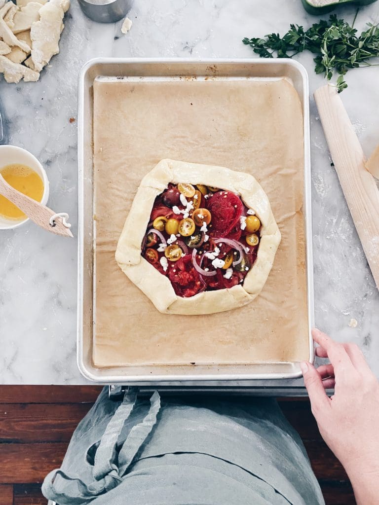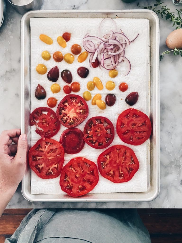 Out of an abundance of caution, transfer the tomato slices to a paper towel lined baking sheet, to further absorb their juice. Don’t worry – there will still be plenty of moisture inside the galette.