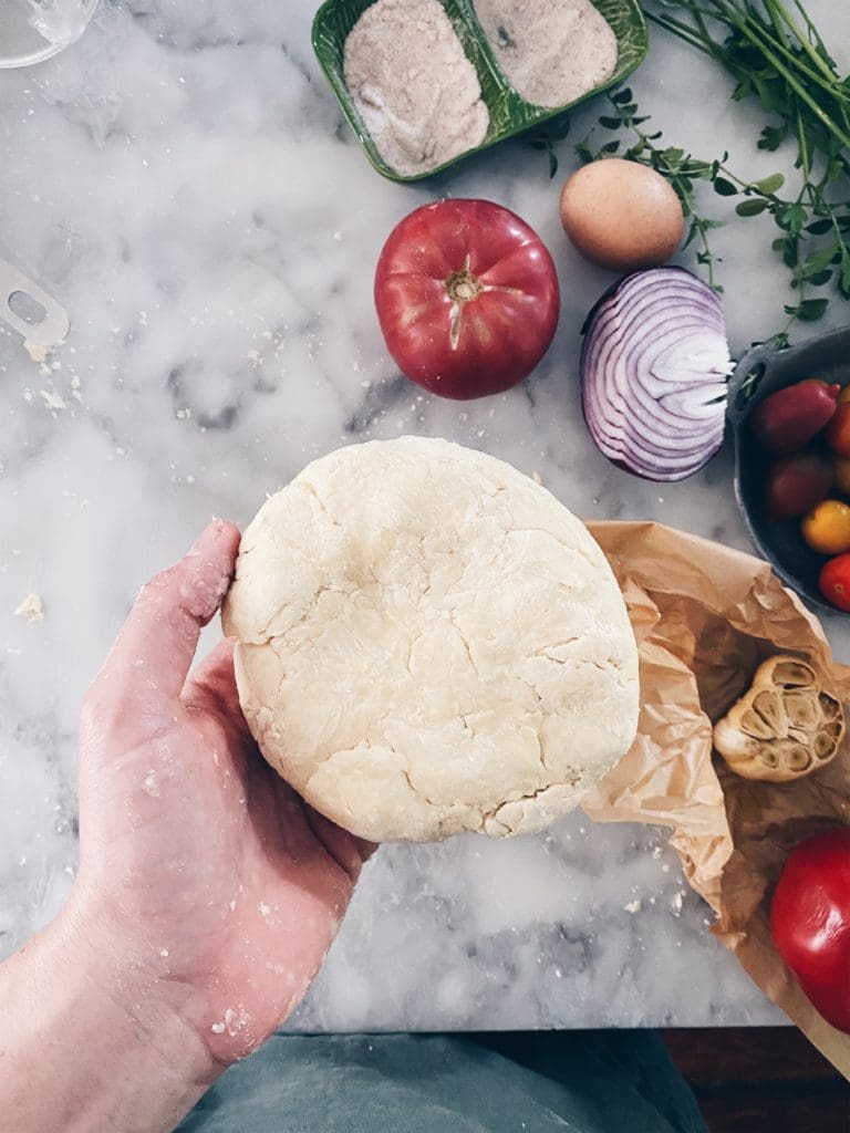 This crust is MAGICAL. Is it the vinegar? The ratio of butter to flour? My god, this is the only crust I will use for any tart or galette – forever more! I used tomatoes and onions on a bed of pesto with extra sharp cheddar and it was delish, but the CRUST is the star of the show! Omgosh!