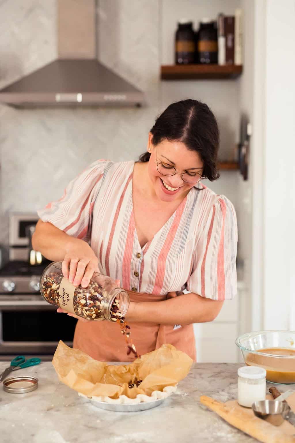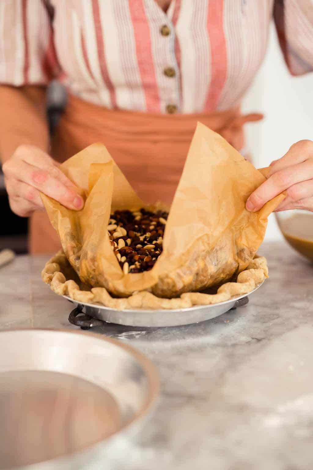 We don’t want to loose the shape of our gorgeous pie crust so we’ll use pie weights (in my case a giant jar of dried beans) to hold the crust in place as it bakes.