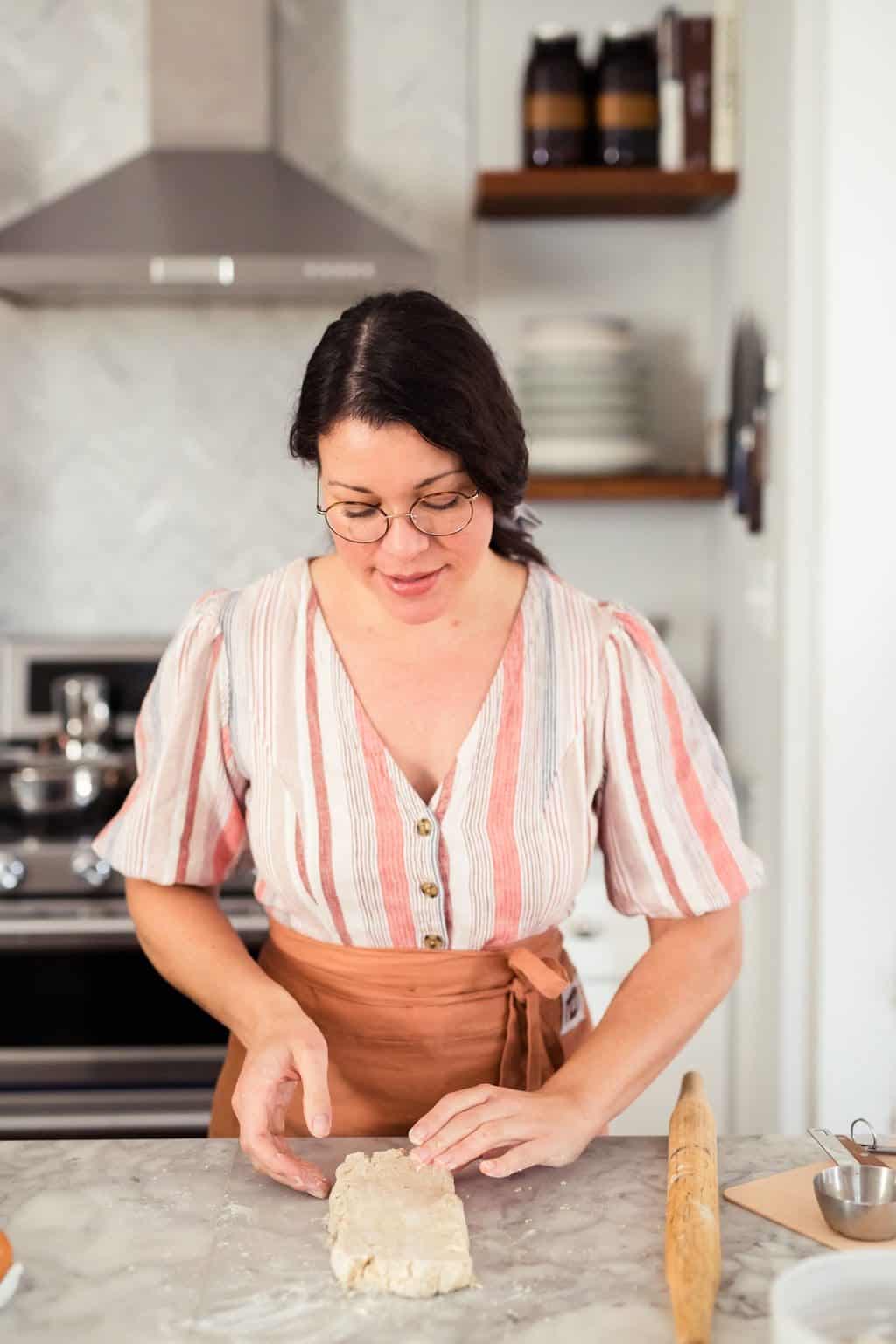 - We’ll laminate the dough before we chill it. Gently roll the dough into a rectangle about 10 to 12-inches long, 4-inches wide and 1-inch thick. (This doesn’t have to be exact.) Position the dough so that the short side is facing you and the long end extends away from you. Fold the bottom of the dough 1/3 of the way up. Fold the top of the dough 1/3 of the way down creating a letter fold.