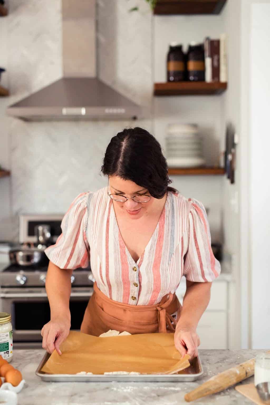 Use your gluten-free flour blend for dusting the work surface and the dough and gently roll it into 10 or so inch rectangle that’s about 1-inch thick.