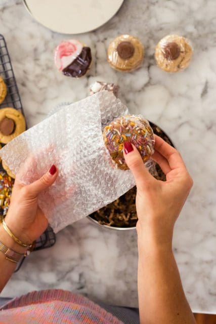 For extra assurance, you can place cookie packets in a bubble wrap pouch. It helps protect the cookies from jostling and helps keep them fresh during shipment. Totally optional and you don’t have to bubble wrap every cookie pack. Bubble wrapping one cookie helps protect the cookies around it.