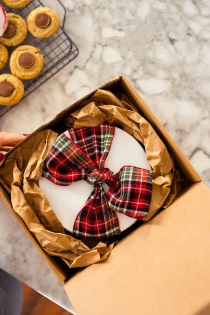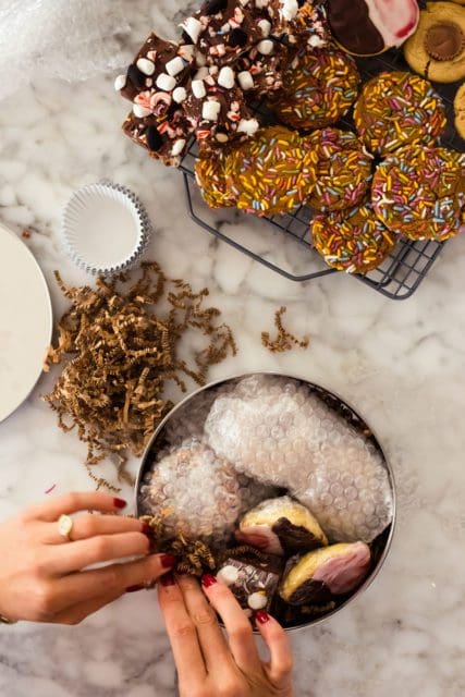 Close the box and give it a shake – a good shake. You don’t want to hear or feel any cookies move around. If you hear something rattling around, take out the tin or box and pack it a little tighter.