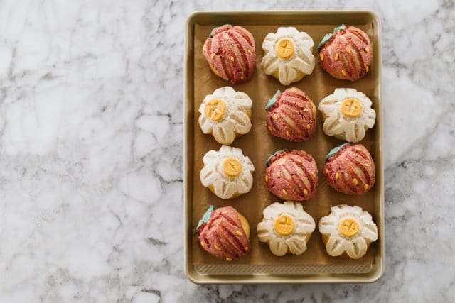 Conchas translates from Spanish as seashells – usually appropriate because the sugar top traditionally resembles a seashell.ย This season we might want to call these conchas fresas (strawberries) or flores (flowers) because we’re making fruit and flower shaped tops for our sweat breads!