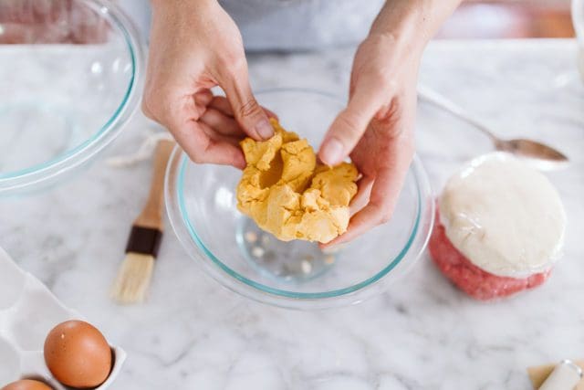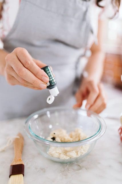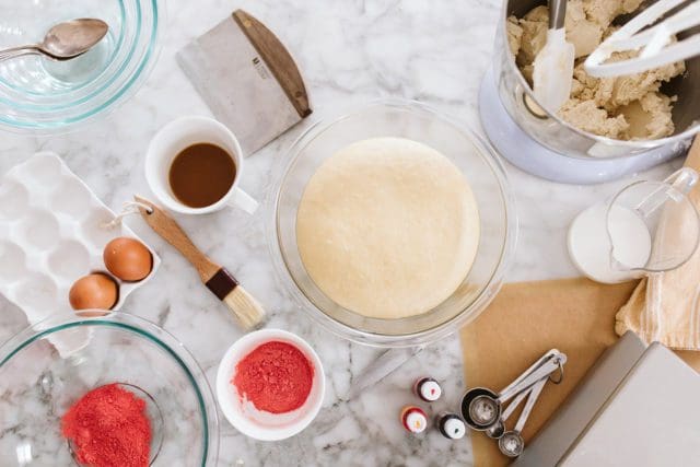 What follows are step-by-step pictures to tint the concha topping, shape the rolls, cut out the topping shapes, and top the rolls.ย If you’d like a step-by-step of making the roll dough or topping dough, please see this post here.ย If you feel like you don’t need all of these instructions, scroll right on down to the recipe and pop back to the post if any step feels confusing.