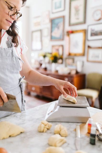 I want each dough portion to be the same size so I weight the whole dough, divide that number by 12 and use my bench scraper to cut and weigh each portion of dough.