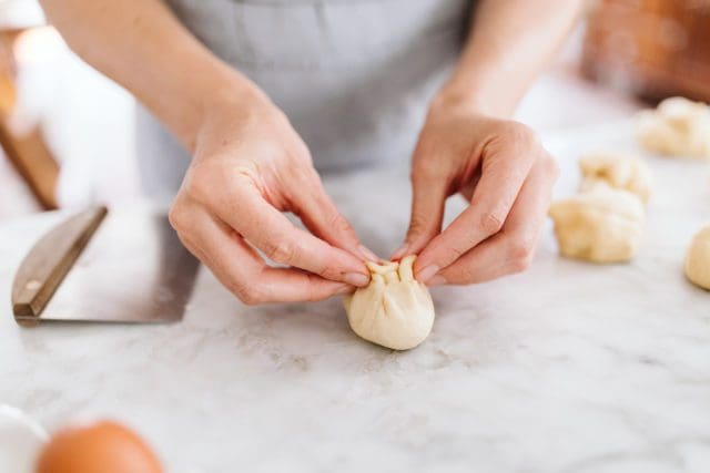 To shape each portion of dough, gather the dough into a little pouch. Gather all the ends up to meet on another.