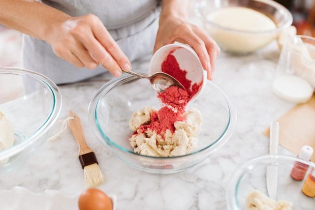 Add the strawberry powder, along with a few drops of red food coloring to the concha topping.