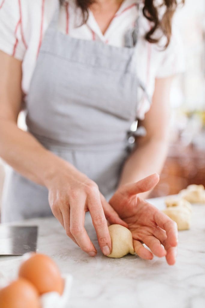 You’re sealing all the edges together and creating a little dough nipple.ย This motion seals what will be the bottom of the roll and helps create tension in the roll which will help the roll keep its tight shape in the oven.