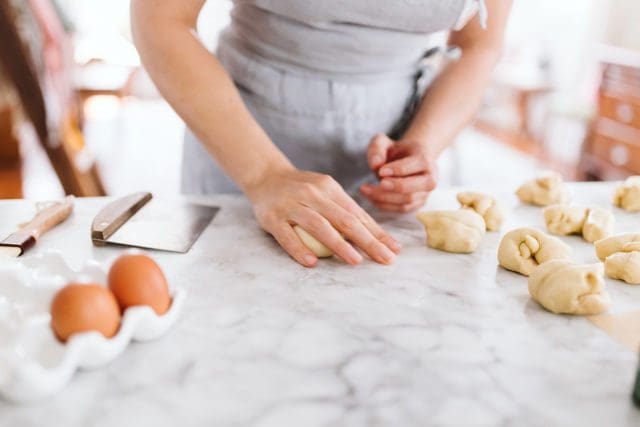 Turn the seam and nipple to the bottom side of the roll, smooth side up.ย Cup your hand over the roll and move your hand in a small clockwise circle to further round and tighten the dough.