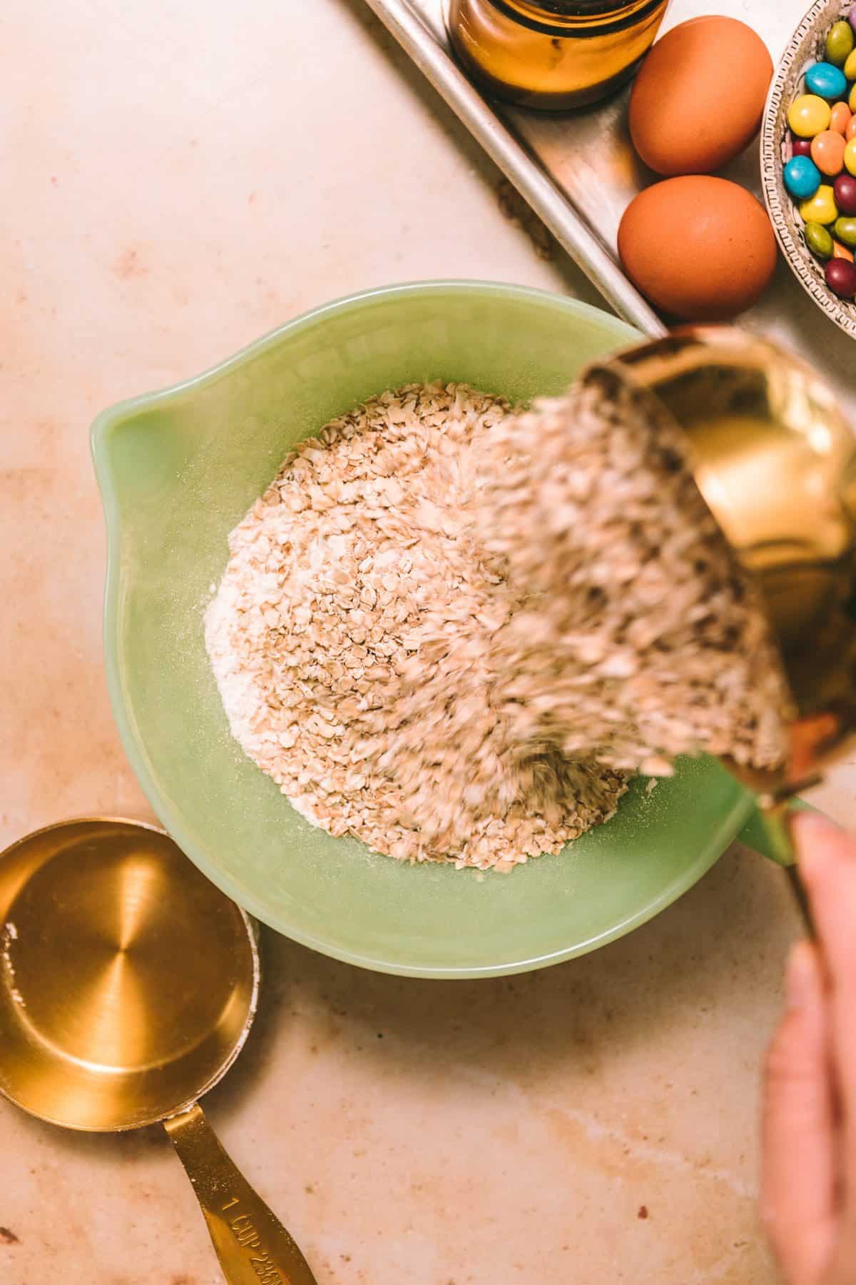 Add the dry ingredients to the creamy butter and egg mixture and incorporate until the oats and flour are just incorporated but a few flour streaks remain.