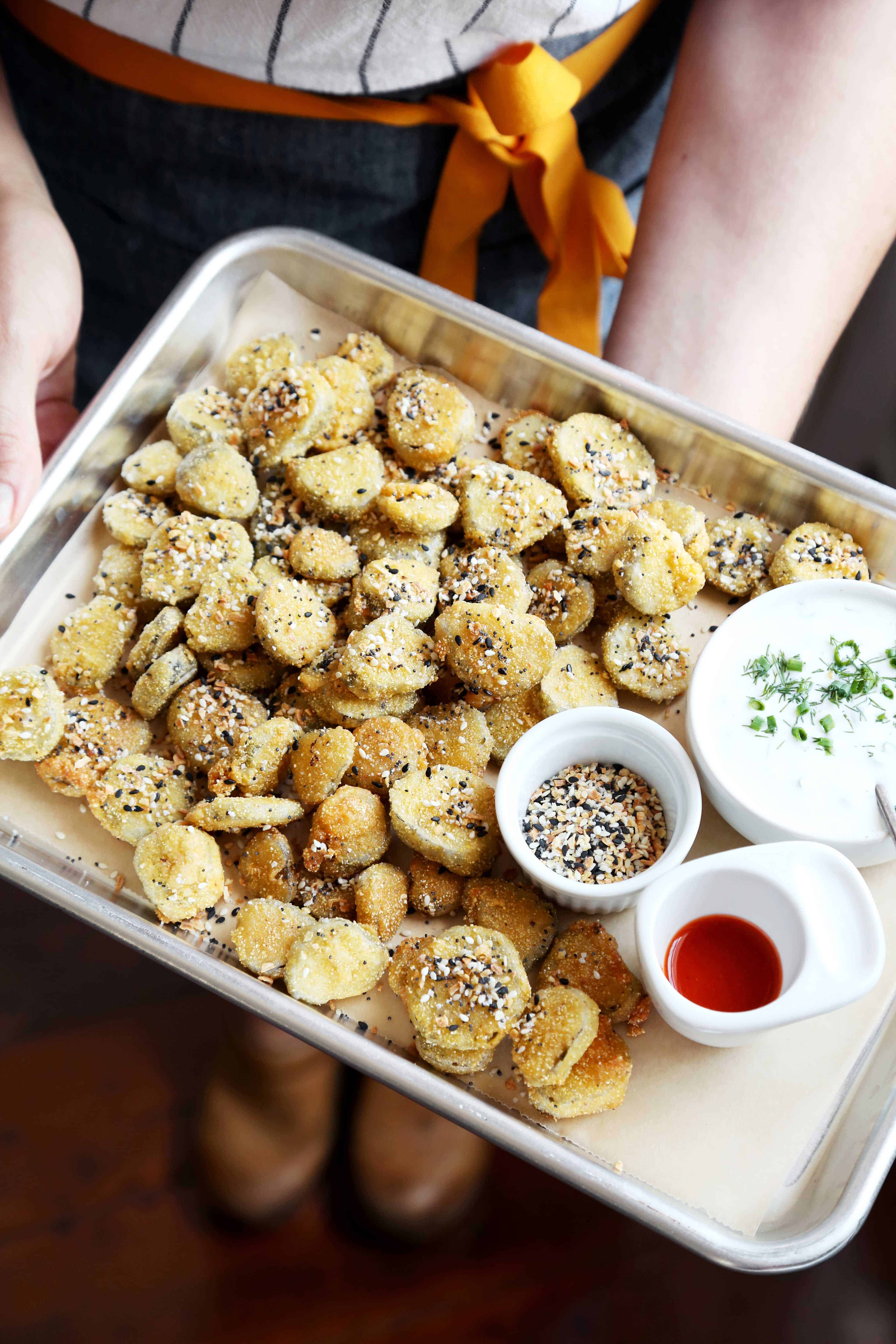 Enter: Everything Fried Pickles with Buttermilk Ranch Dip. Now, maybe you’re thinking this is a crazy idea in addition to the onion rings. But to that I say, Hey, this is a party. And what better way to celebrate than with copious amounts of fried food? You can streamline the process by making a double batch of the ranch dip and using it for both items. That stuff is so good, you could even bathe in it. Let’s make it that kind of party. These fried pickles are sour and bright, crisp, exciting and—due to the addition of the Everything Bagel seasoning—downright clever. Just like the movie.
