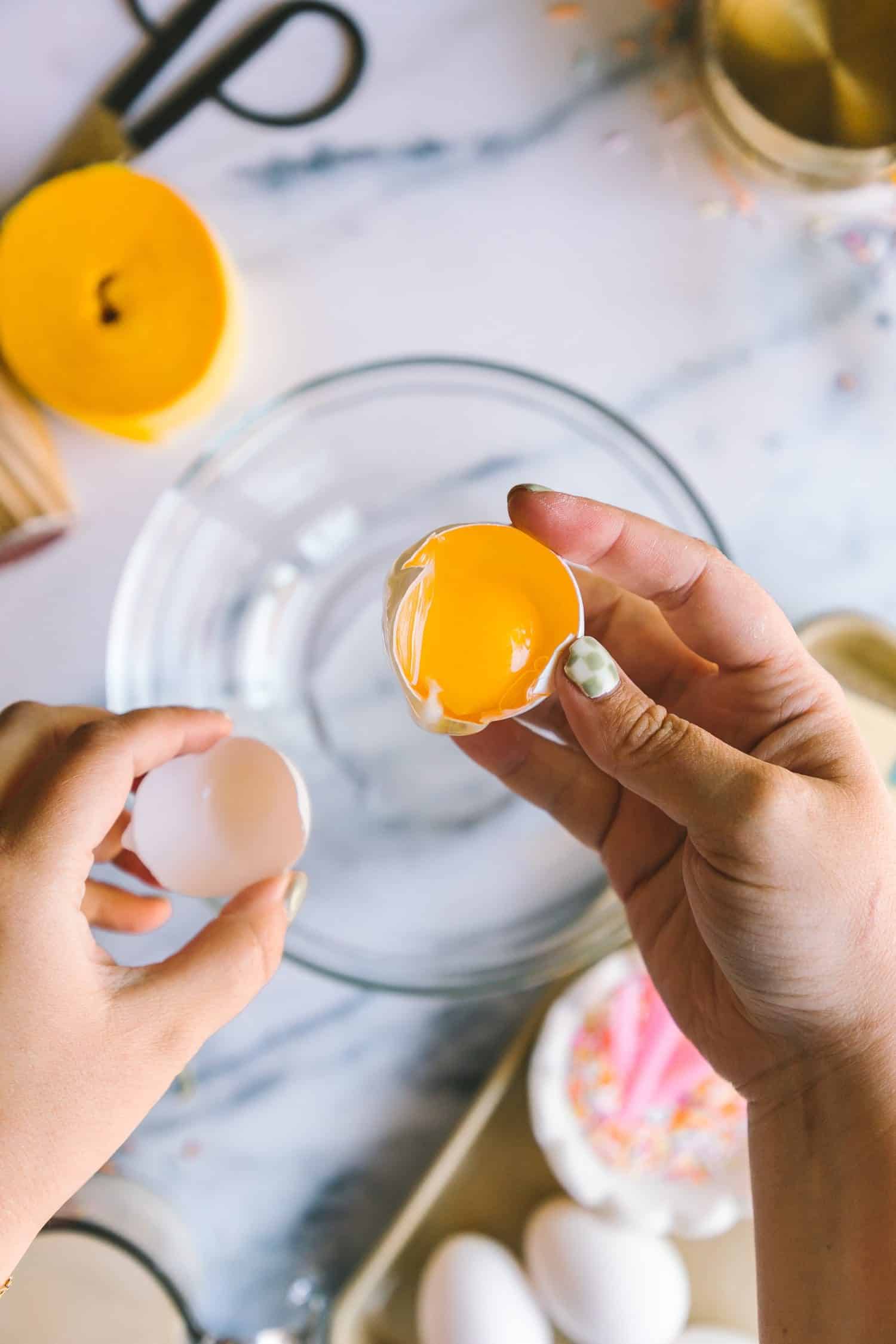 And lastly, for this classic vanilla cake batter, fold in the egg whites in three batches.ย The first batch will feel clunky and awkward because the texture of the two components are so different but by the third batch of egg whites, the batter will feel fluffy and aerated.