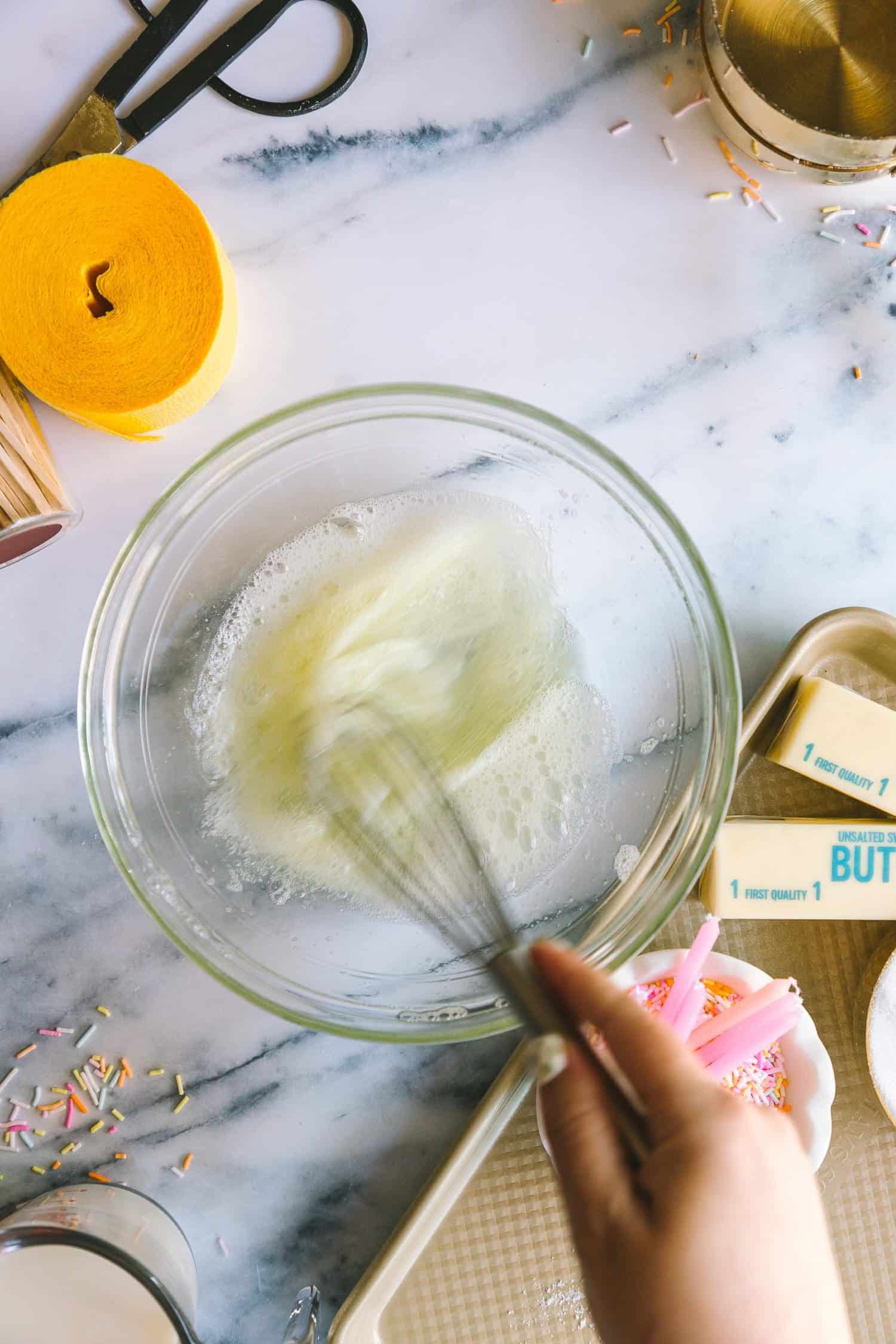 With the egg whites whipped and the flour sifted (whew… I know), cream together the butter and sugar in a large bowl or in the bowl of a stand mixer on low speed using the paddle attachment.ย Add vanilla extract and that tiny splash of almond extract.