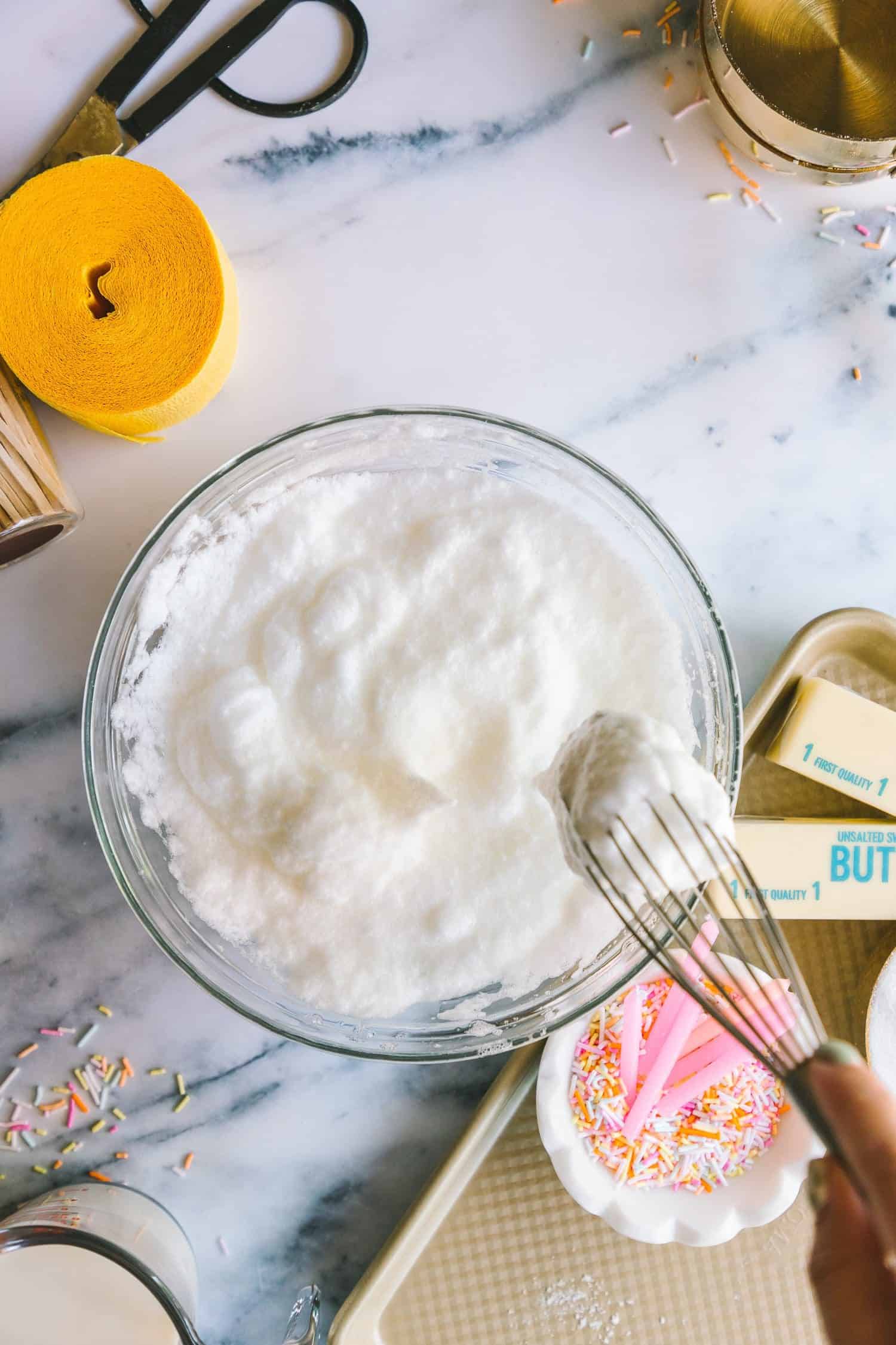 In a clean and dry bowl or the bowl of a stand mixer fitted with a whisk attachment, whip egg whites to stiff peaks.ย They should hold their shape and be almost crunchy cloudy (which is not a technical term but perhaps should be).ย Add the air incorporated into the egg whites will translate to the cake batter, lending structure and tenderness.