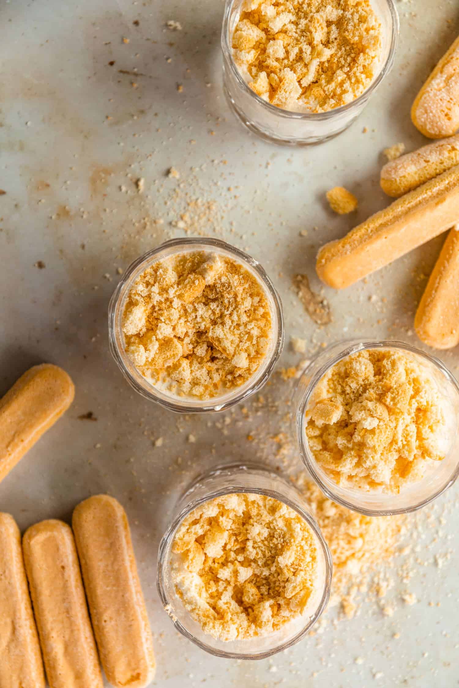 Crumble three ladyfinger cookies per serving dish. Top with a few big spoonfuls of swoopy cream and press down gently to ease out any air pockets.ย Top with another layer of 2 crumbled cookies and a final generous layer of the sweetened cream.