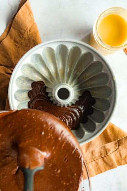 - Pour the wet ingredients into the dry and use a rubber spatula to fold the two together. The batter will be fairly loose but whisk until no lumps remain. Pour the batter into the prepared Bundt pan, scraping the bowl to get every last bit.