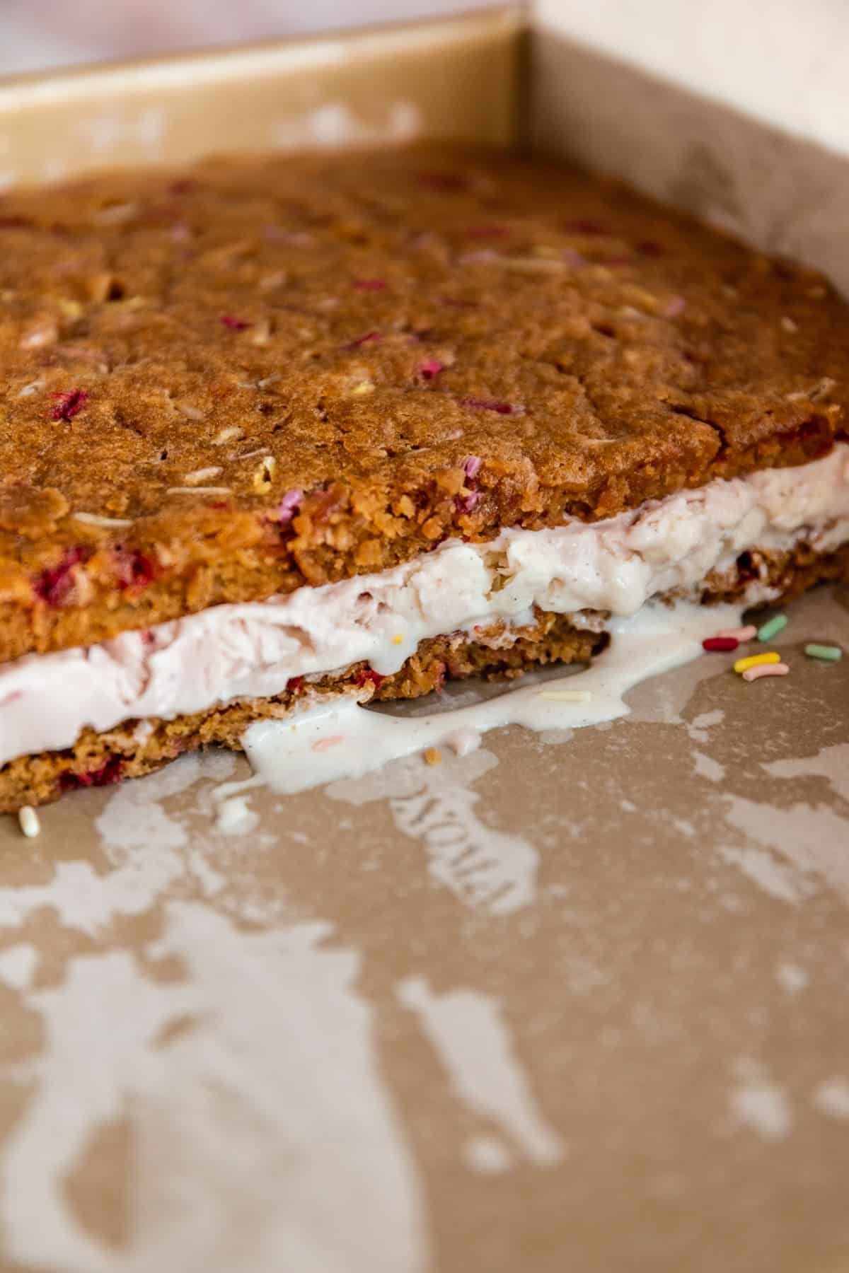 - Once the blondie is cold to the touch, run a knife around the edges of the pan to loosen. Use the parchment paper to slide the blondie from the pan and cut in half widthwise. Return the used parchment to the pan so that it covers the bottom of the left side of the pan and then drapes over the left edge. Weโll use the parchment to help shape the sandwiches. Place half of the blondie you just cut on top of the parchment paper inside the pan, upside down. Scoop the ice cream in small scoops, alternating vanilla and strawberry across the blondie. Sprinkle with 2 tablespoons of sprinkles and use the offset spatula to quickly press the ice cream into an even layer. Press the second blondie half, right side up, onto the ice cream, using the hanging parchment to help press the blondie down. Place the pan in the freezer.