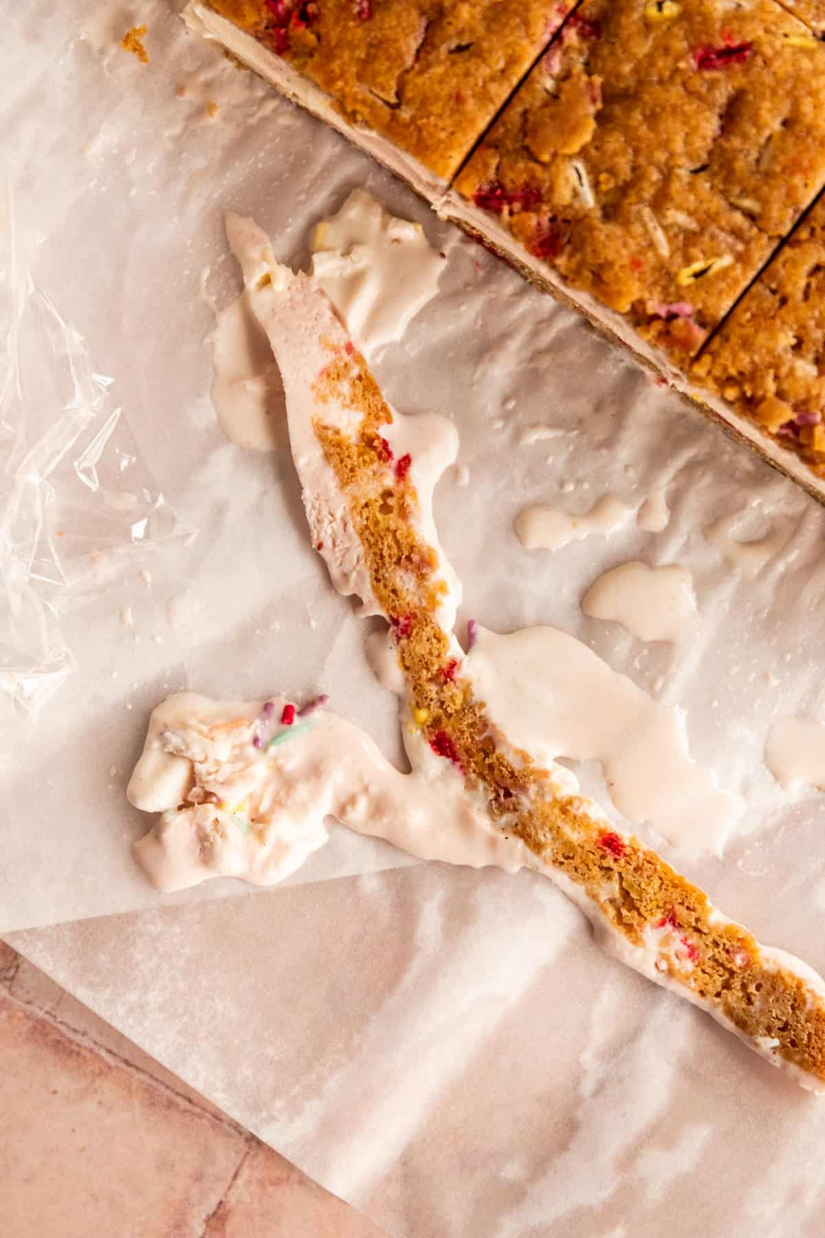 Once the ice cream has frozen through, unwrap and place the blondie slab on a cutting board and slice in a dozen small but mighty 2-inch cubes.ย Dip a side of each square in more sprinkles and either enjoy immediately or place on a small rimmed baking sheet to store in the fridge until showtime.
