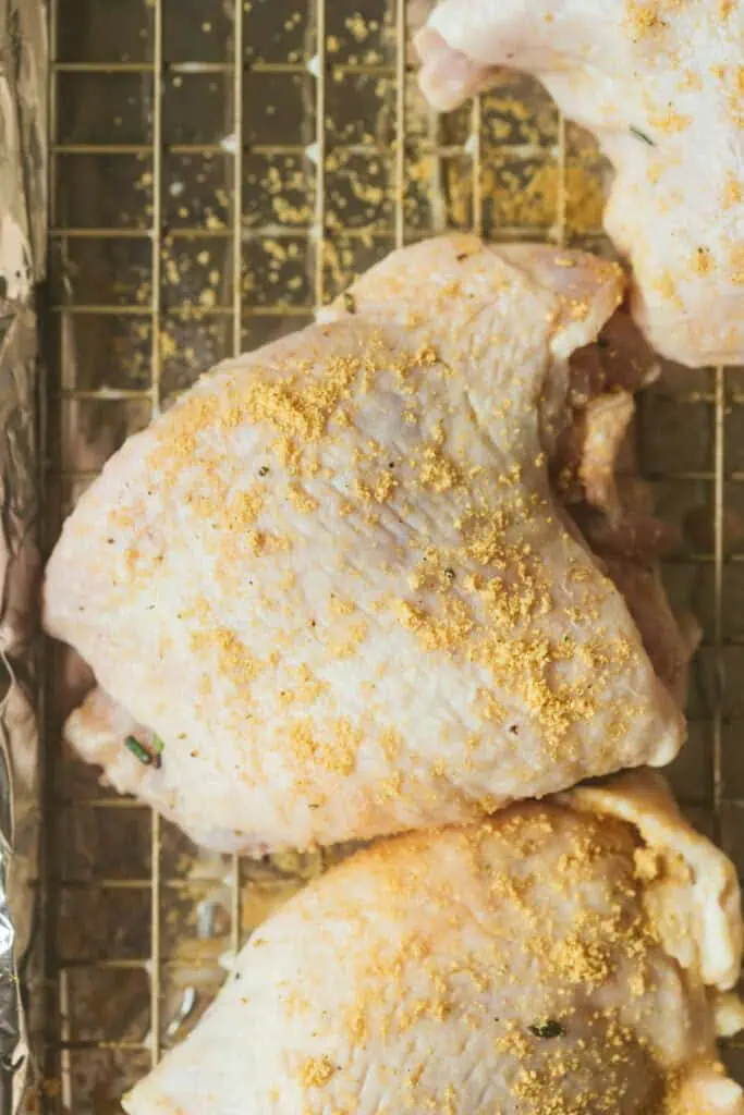 - Roast to Crispy Perfection:ย Preheat the oven to 400ยฐF for a regular oven of 375ยฐF for a convection oven. Remove the chicken from the marinade, letting the excess drip off and sweeping the marinade off with your hands. Line a sheet pan with foil and place a wire rack on top. Arrange the chicken thighs skin-side up on the rack and pat dry with a paper towel. Sprinkle both sides of each piece of chicken with a good amount of seasoning.