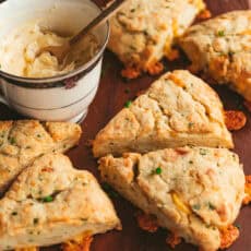 Cheddar Chive Scones with Hot Honey Butter are big, flaky, and unapologetically savory, with sharp cheddar tucked into every layer and fresh chives for a gentle oniony bite. The scones bake up golden and tender, then get finished with a swipe of whipped hot honey butter—just enough sweetness and heat to make brunch feel a little bit special (and a little bit indulgent). Perfect for slow mornings and coffee refills.